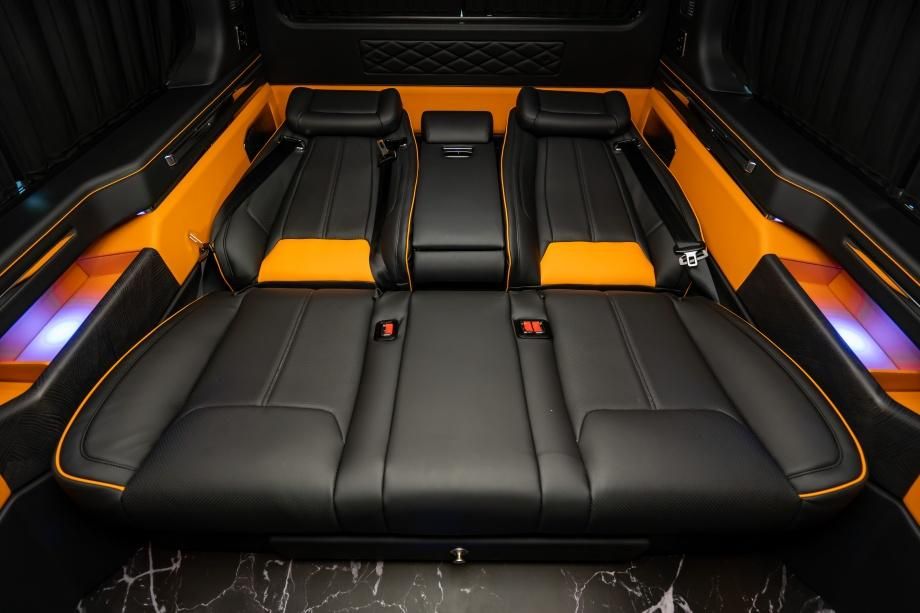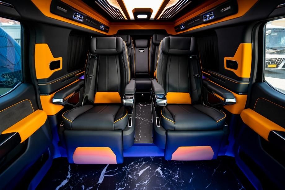 岩板拼接处选用隐形美缝工艺,缝隙宽度仅 0.5mm,视觉上构成 “无缝全域地上”,拉伸座舱纵深感;边际以镀铬金属压条收边,与黑橙内饰的银色明线照应,过渡天然流通。即使 7 人满员高频运用,长期下来地板仍能坚持 “出厂级” 整齐,适配家庭侨居、商务招待等高频场景。