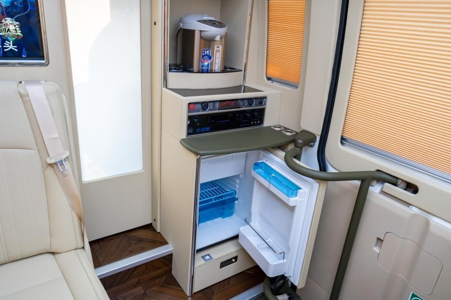 车尾设隐藏式车载卫生间,装备便携式马桶与折叠洗手池,顶部嵌入静音换气扇,运用时空气流通无异味,彻底处理 8 人远程出行 “如厕难” 问题。卫生间门选用与内饰同色软包规划,闭合后与座舱融为一体,不损坏全体风格;内部设收纳袋,寄存卫生纸、洗手液等用品,细节处尽显人性化。